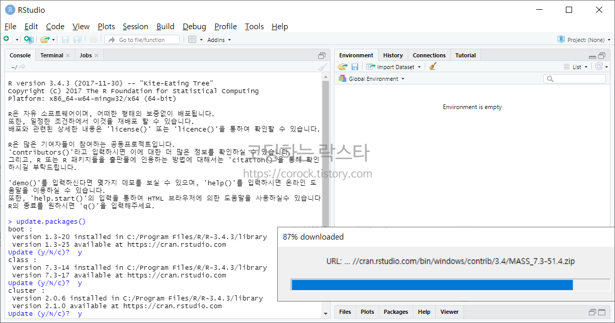 R 패키지의 업데이트 - 콘솔창에 입력(시간이 많이 걸림)