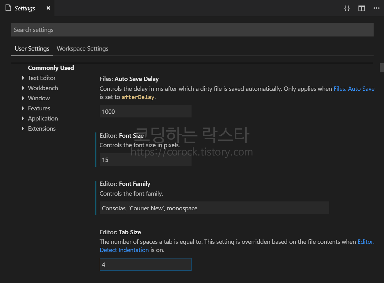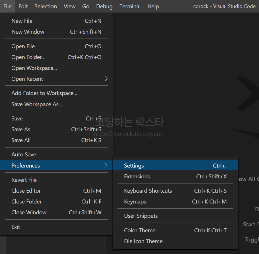 File - Preferences - Settings 로 가봅시다.