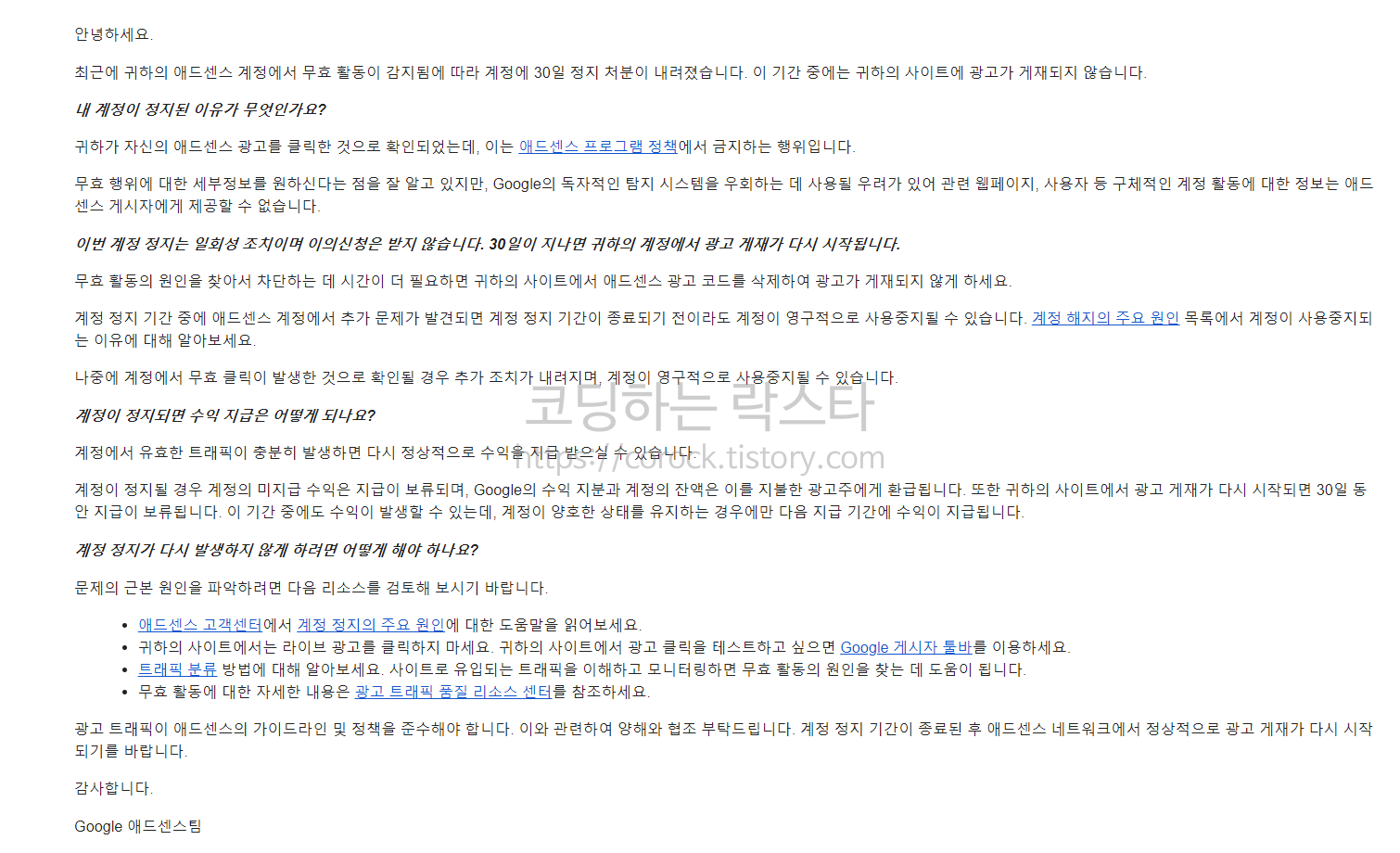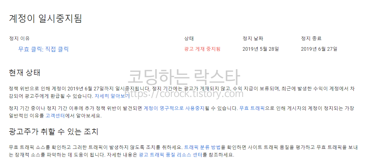 30일 정지 처분이라니... 그대로 다행인 건 초범(?)이라 일회성 조치이며 30일 후에는 다시 광고를 게재할 수 있다고 하는군요. 본인이 직접 광고를 클릭해도 수익이 전혀 안 나고 있는 상태기 때문에 이런 행동에 크게 인지하고 있지 않은 상태였습니다. 저는 사태의 심각성을 인지하고 구글 애드센스 홈페이지로 한번 접속해봤습니다.