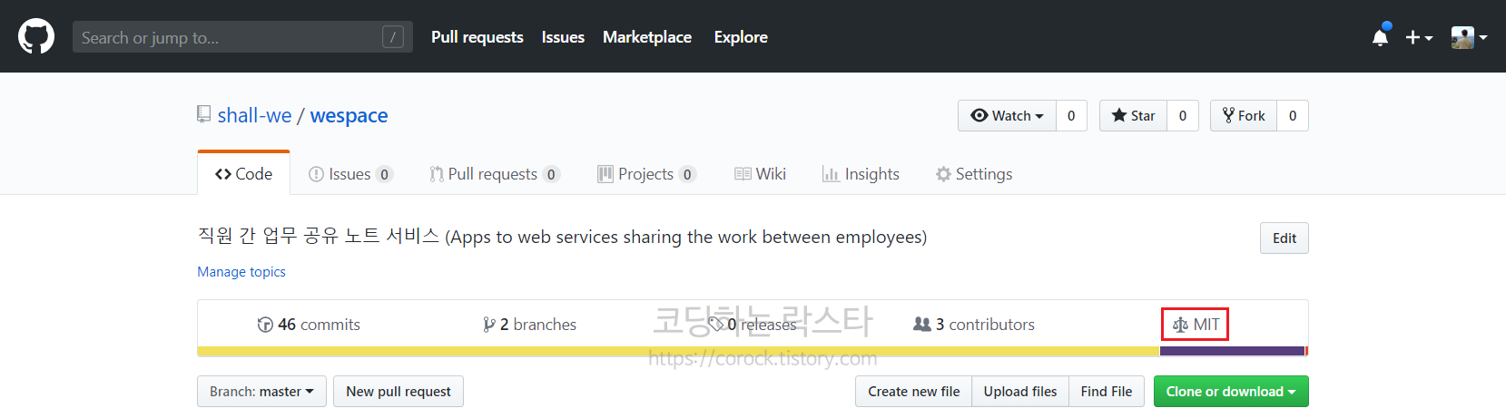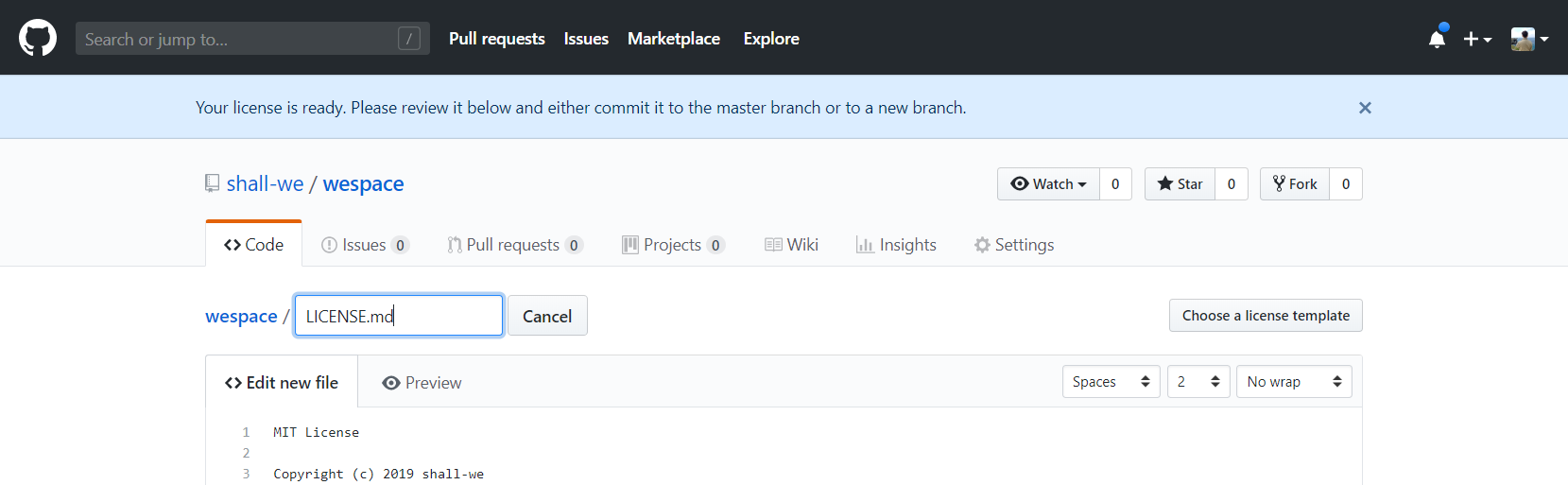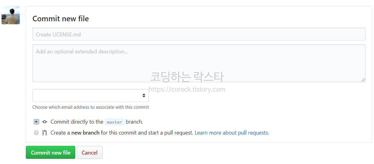 - Commit directly to the master branch: 해당 라이선스 파일을 master 브랜치로 Push