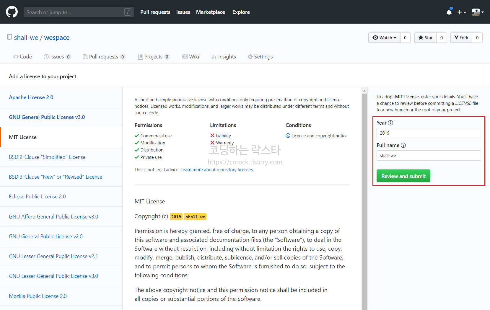 본 프로젝트의 년도와 이름을 기입하고 Review and submit 버튼을 누르면 라이선스 파일이 생성됩니다.