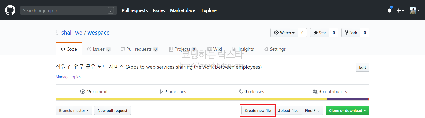 먼저 라이선스를 표기할 필요가 있는 원격 저장소 하나가 필요합니다. 만약 어떤 프로젝트를 개발하다 라이선스를 가지고 있는 모듈이나 코드 등을 사용했는지 확인해봅니다. 해당하는 Repository로 가서 Create new file 버튼을 클릭합니다.
