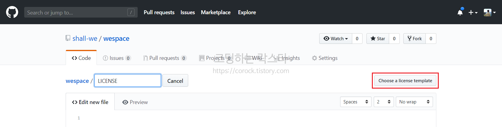 아래의 스크린샷에 보면 [저장소 이름]/○○○ 부분이 보입니다. 여기에 LICENSE를 입력하게 되면 마법같이 Choose a license template 버튼이 생깁니다. 만약 독자적인 양식이 있는 라이선스가 있다면 이 버튼을 누르지 않고 하단의 Edit new file에서 수동으로 작성하면 됩니다. 보통은 파일 이름을 LICENSE까지만 해두는 경우가 많지만, LICENSE.md, license.txt 등 자유롭게 명명할 수 있습니다.
