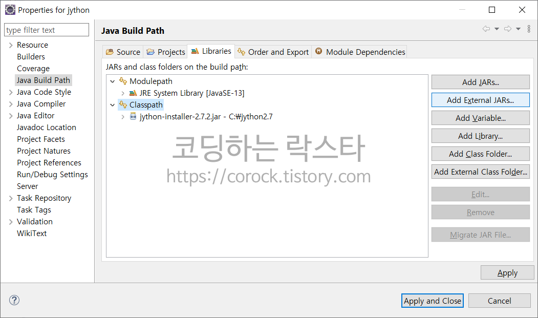 이클립스의 [Preferences] - [PyDev] - [Interpreters] - [Jython Interpreter] 메뉴에서 jython 2.7.2 경로 지정