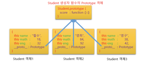동일한 생성자 함수로 생성된 객체들은 내부적으로 __proto__ 프로퍼티를 사용하여 생성자 함수에 존재하는 Prototype 이라는 프로퍼티를 참조하여 같은 공간을 공유한다.