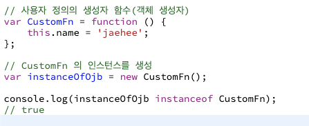 따라서, 객체를 반환하는 생성자 함수를 통해 만든 객체 또는 인스턴스에만 해당 연산자를 사용해야한다.