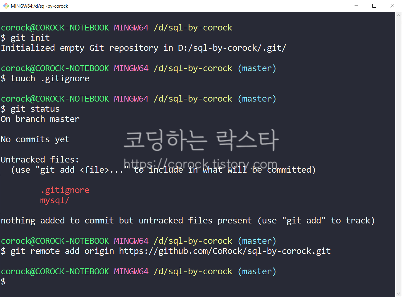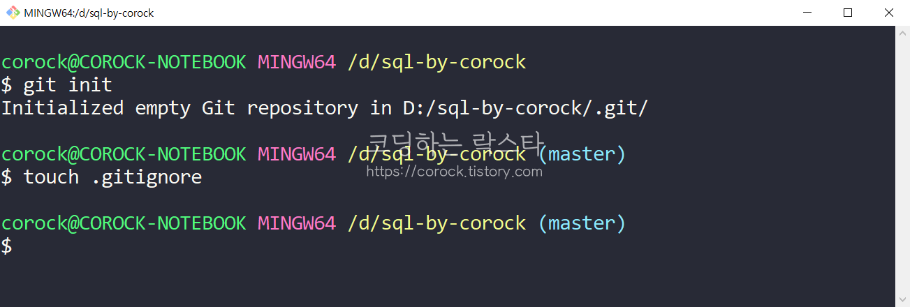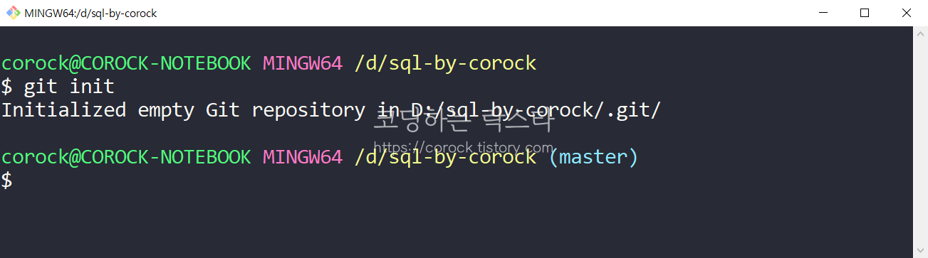 Git Bash Here로 터미널에 접속했기 때문에 현재 디렉토리는 노란색 부분인 /d/sql-by-corock 입니다. 여기서 git을 사용할 수 있도록 다음과 같은 명령어를 입력합니다.