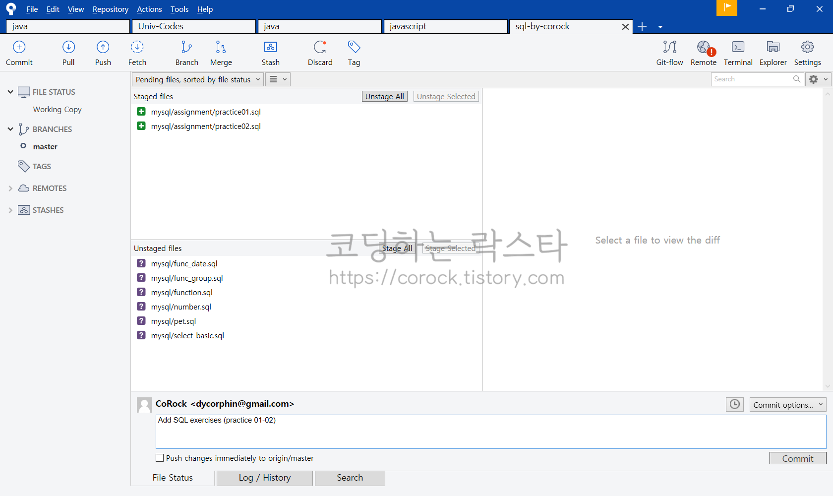 앞의 방식대로 추가적으로 작업이 있다면 진행하시면 됩니다. 이번에는 practice01.sql과 practice02.sql를 완성하고 추가로 커밋을 진행해보겠습니다.