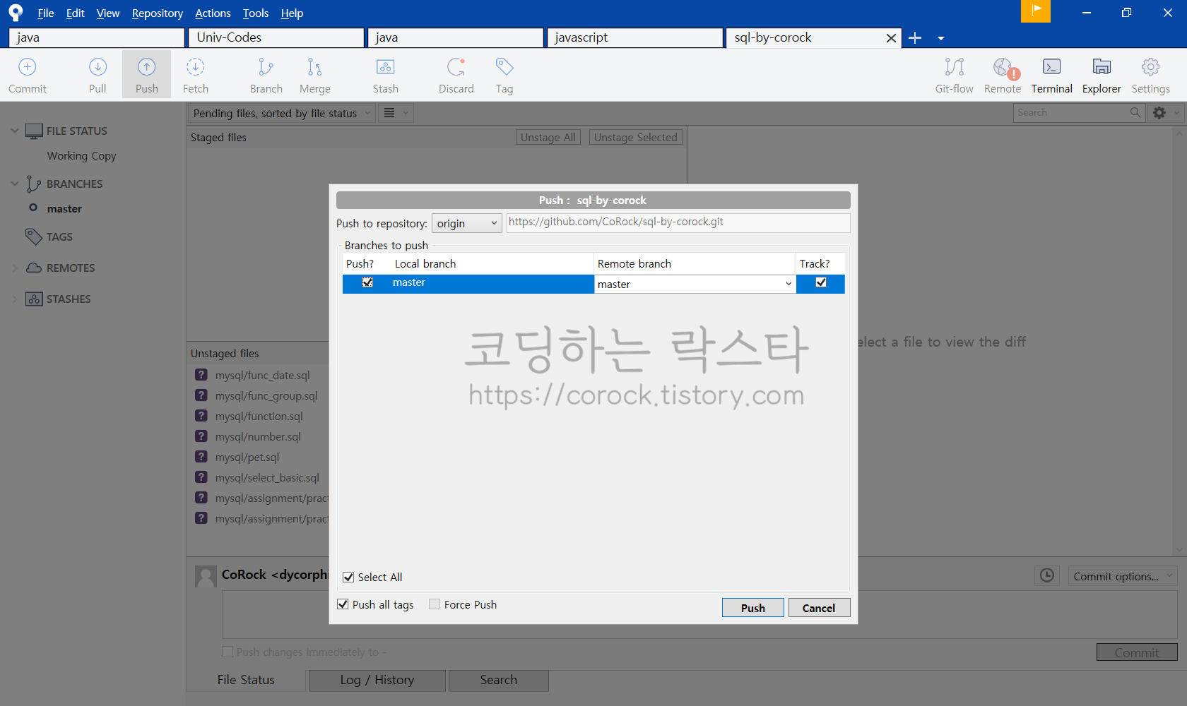 상단 탭 중 Push 버튼을 클릭하여 Local branch와 Remote branch를 설정합니다. 설정하지 않을 시 기본값으로 master 브랜치로 지정됩니다.