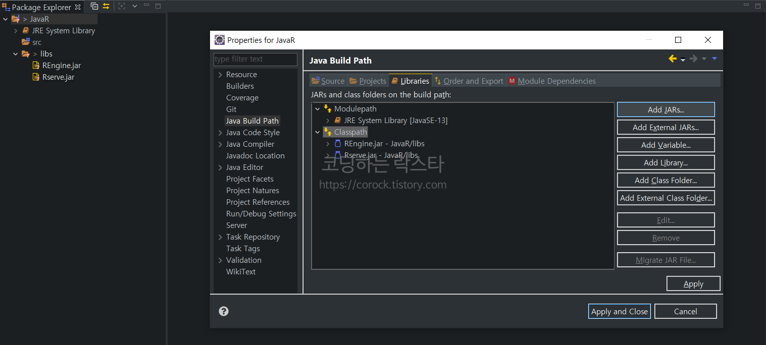 C:\Users\사용자계정\Documents\R\win-library\3.4\Rserve\java 디렉터리의 REngine.jar, Rserve.jar 2개의 파일을 libs에 복사한 후 Java Build Path / Libraries
