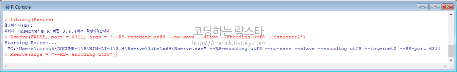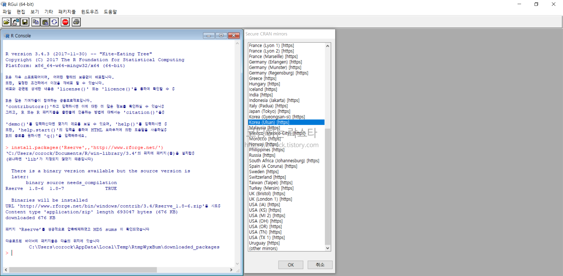 16.2.1 RGui(R console)를 실행한 후 Rserve 패키지 설치(RStudio에서도 실행 가능)